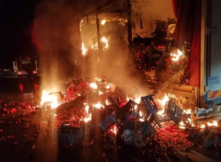 Mersin'in Tarsus ilçesinde seyir halindeki domates yüklü bir kamyonda yangın çıktı.