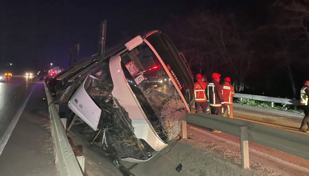 Çanakkale’den Ankara’ya gittiği öğrenilen 06 BFV 850 plakalı çeşit otobüsü, İnegöl ilçesi Şehitler mevkisinde, bariyere çarparak devrildi.