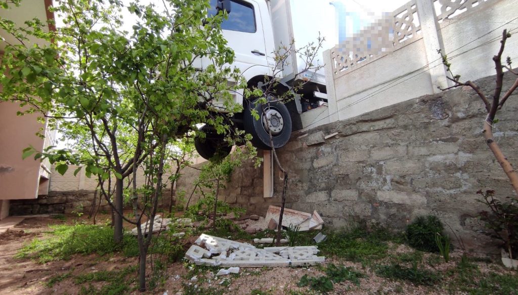 Sürücüsünün ismi öğrenilemeyen 34 KL 0696 plakalı market materyali yüklü kamyon, teze nazaran freni boşalınca denetimden çıkıp sokağın sonundaki meskenin bahçe duvarını yıkarak askıda kaldı.