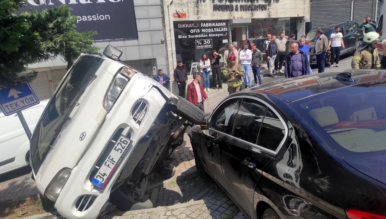 İstanbul Kağıthane’de arabasıyla orta sokaktan yokuş aşağıya inen Okan Danyıldız, kullandığı arabanın direksiyon hakimiyetini kaybederek evvel kaldırımdaki bayana daha sonra da park halindeki minibüse çarptı.